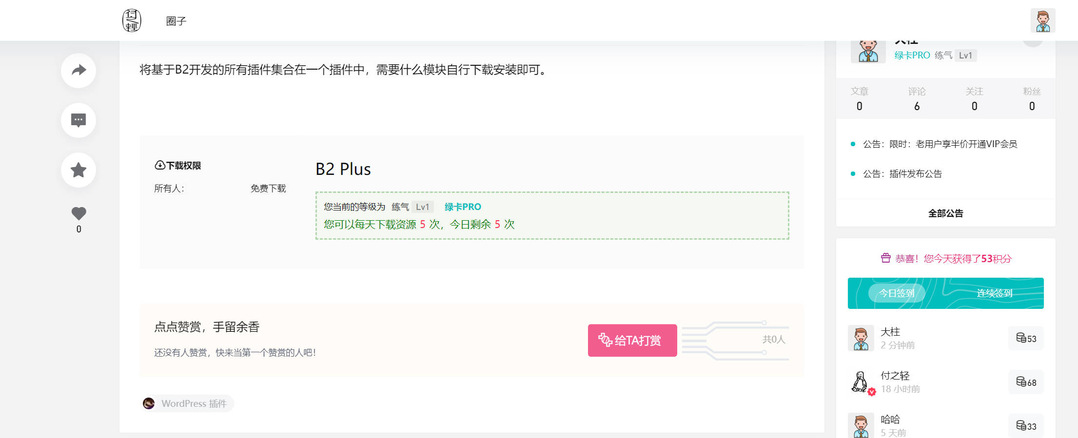B2 Plus WordPress插件 22年11月2日 编辑 前往下载 付之轻超级管理员 取消关注 关注 私信 将基于B2开发的所有插件集合在一个插件中,需要什么模块自行下载安装即可。 功能模块下载地址:https://fuzqing.com/b2-plus-modules 下载权限查看 ¥ 免费下载 评论并刷新后下载 登录后下载 查看演示 {{attr.name}}: 您当前的等级为 登录后免费下载登录 小黑屋反思中,不准下载! 评论后刷新页面下载评论 支付¥以后下载 请先登录 您今天的下载次数(次)用完了,请明天再来 支付积分以后下载立即支付 支付以后下载立即支付 您当前的用户组不允许下载升级会员 您已获得下载权限 您可以每天下载资源次,今日剩余次 给TA打赏 共{{data.count}}人 人已打赏 WordPress 插件